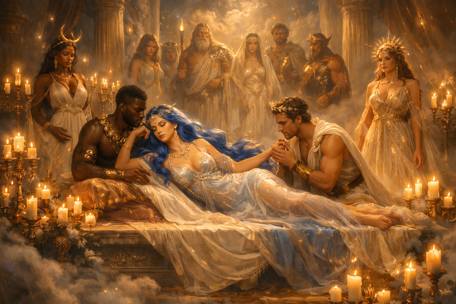 There they lay…an Archani and an Elfin Goddess…languishing upon the narrow pallet atop the lofty platform, scarcely a breath from where I sat. Their mouths met in silken, rosy kisses, each one deeper, more zealous than the last…