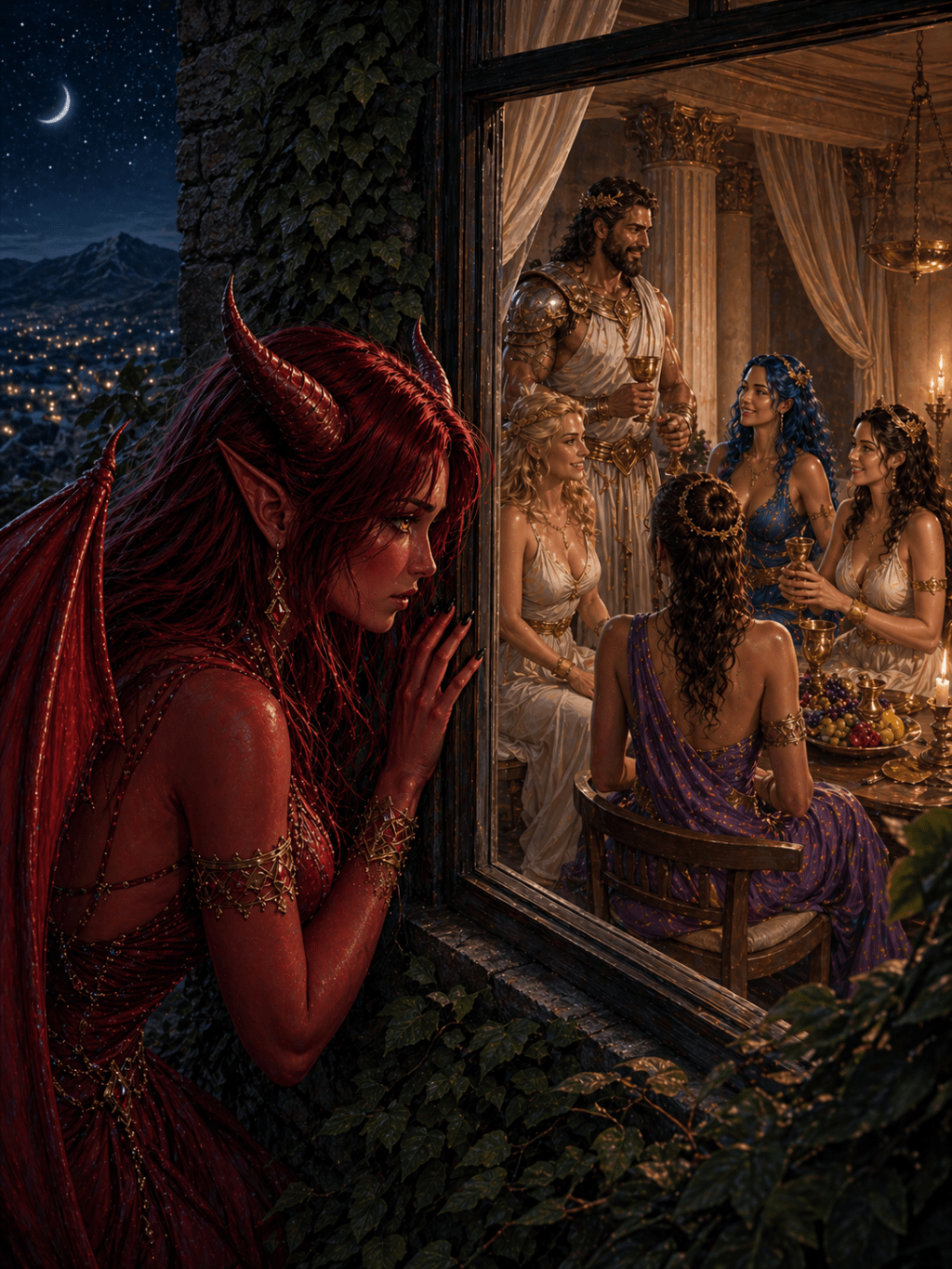 Her forked tongue flicked slowly over her bloodred lips, sinuous, intent. The glass cooled her brow when she finally leaned into it, a faint mist rising where fervor met cold – but the deprivation only sharpened.