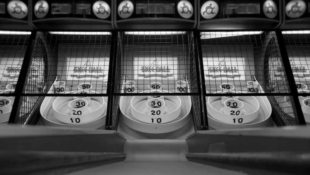 I tossed the Skee-Ball up, feeling the heavy wooden weight each time it thudded into my palm. I felt split in two. Coated in war paint, my competitive Celtic ancestors banged their shields in a challenge. This weakling man would not beat me.